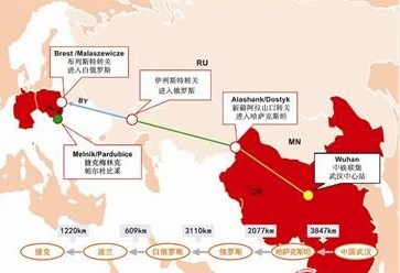 該專列自武漢東西湖鐵路中心站發(fā)出后,經(jīng)安康、西安、蘭州、烏魯木齊,到達(dá)新疆邊境口岸阿拉山口出境,穿越哈薩克、俄羅斯、白俄羅斯、波蘭后,抵達(dá)捷克梅林克,行程10,863公里,所需時(shí)間僅為海運(yùn)方式的一半。